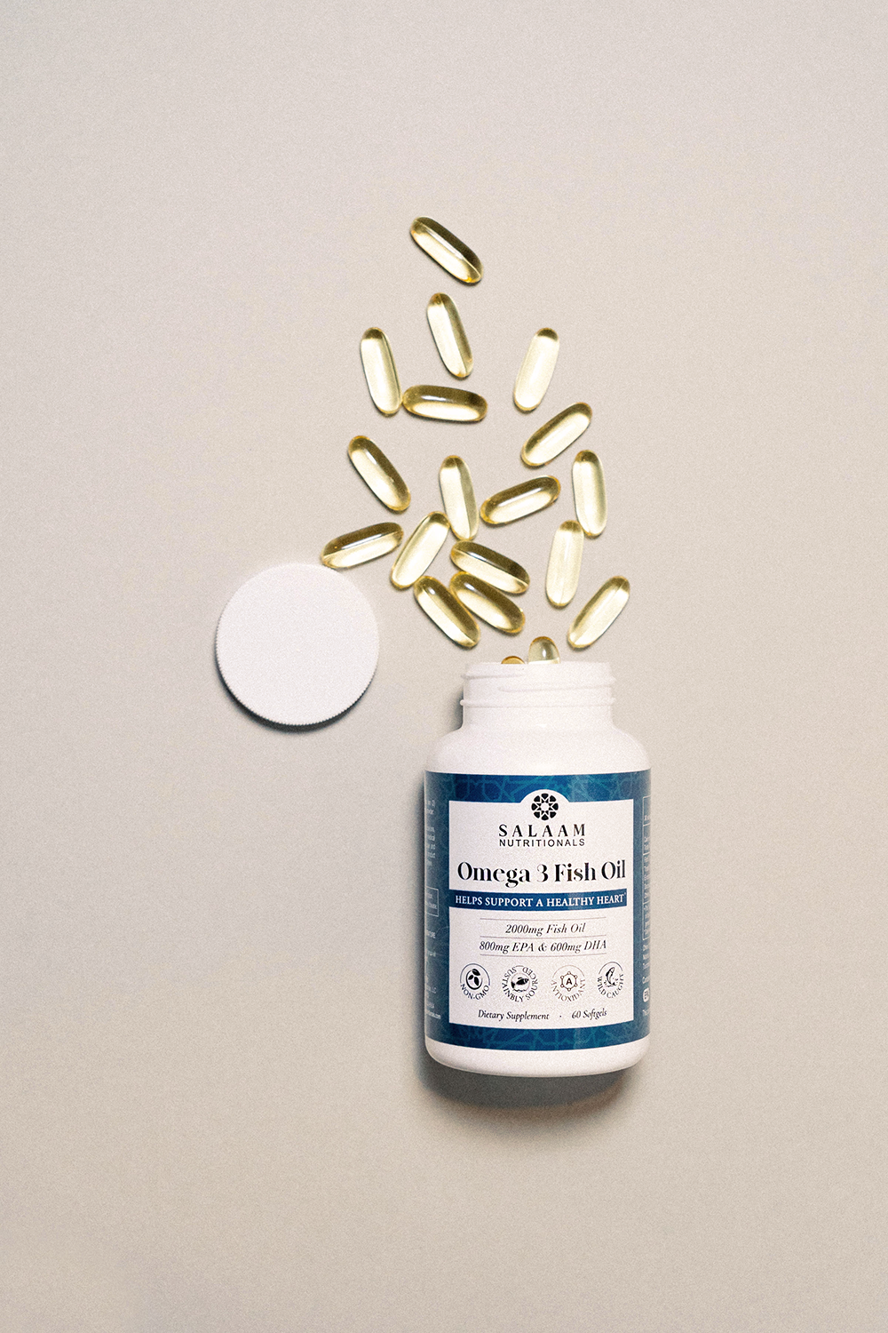 Elevate your wellness routine with Salaam Nutritionals Omega 3 + EPA/DHA Halal Fish Oil Soft Gels. Sourced from premium wild-caught anchovies, our non-GMO fish oil delivers a high concentration of Omega-3 fatty acids (1400 mg per serving) to support heart, brain, and eye health. Refined for purity and effectiveness, these soft gels offer superior nutritional benefits without any fishy aftertaste or digestive discomfort.